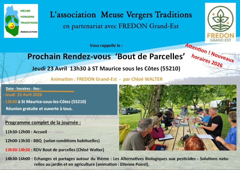 L’association Meuse Vergers Traditions vous invite au prochain Rendez-vous ‘Bout de Parcelles’ qui se tiendra Jeudi 23 Avril 2026 (de 13h30 à 14h30), à St Maurice sous les côtes et animé par FREDON Grand-Est (Chloé Walter).